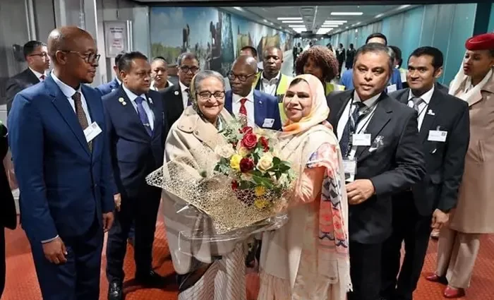 ব্রিকস শীর্ষ সম্মেলনে যোগ দিতে দক্ষিণ আফ্রিকার জোহানেসবার্গে পৌঁছেছেন প্রধানমন্ত্রী শেখ হাসিনা। প্রধানমন্ত্রী ও তাঁর সফরসঙ্গীদের বহনকারী এমিরেটস এয়ারলাইন্সের একটি নিয়মিত ফ্লাইট (ইকে-৭৬৫) রাত ৮টা ৩৫ মিনিটে (স্থানীয় সময়) জোহানেসবার্গের ওআর টাম্বো আন্তর্জাতিক বিমানবন্দরে অবতরণ করে। বিমানবন্দরে দক্ষিণ আফ্রিকার সমবায় শাসন ও ঐতিহ্য বিষয়ক মন্ত্রী পার্ক টাউ এবং সেদেশে বাংলাদেশের হাইকমিশনার নুর-ই হেলাল সাইফুর রহমান প্রধানমন্ত্রীকে স্বাগত জানান। সেখানে পৌঁছালে প্রধানমন্ত্রীকে গার্ড অব অনার প্রদান করা হয়। বিমানবন্দর থেকে তাকে রেডিসন ব্লু হোটেল স্যান্ডটনের প্যালেস অফ রেসিডেন্সে মোটর শোভাযাত্রার মাধ্যমে নিয়ে যাওয়া হয়। এর আগে, গতকাল (২২ আগস্ট) বাংলাদেশ সময় সকাল ১০টা ১৫ মিনিটে হযরত শাহজালাল আন্তর্জাতিক বিমানবন্দর থেকে ফ্লাইটটি যাত্রা করে।